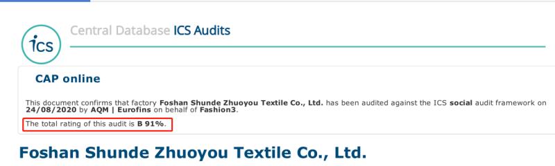 祝佛山市順德區(qū)卓?jī)?yōu)紡織品有限公司一次性通過(guò)AQM審核ICS驗(yàn)廠取得B級(jí)91分