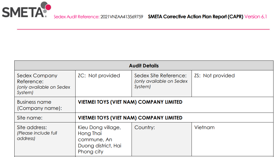 越美玩具(越南)有限公司【VIETMEI TOYS (VIET NAM) COMPANY LIMITED】在創(chuàng)思維技術(shù)服務(wù)(越南)有限公司輔導(dǎo)中2021年順利通過(guò)ITS突擊審核的Sedex 4P驗(yàn)廠,創(chuàng)思維2020年還幫助貴司順利通過(guò)ICTI驗(yàn)廠。