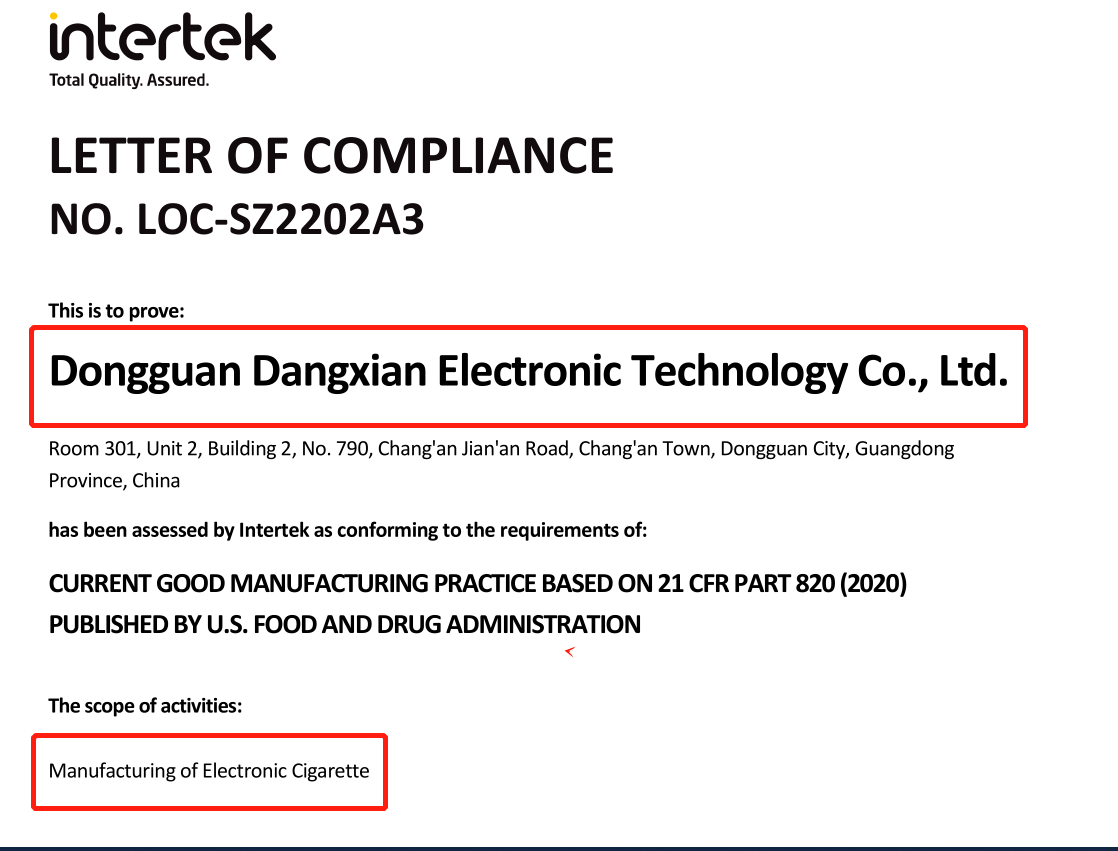 當(dāng)先電子2022年在創(chuàng)思維中國驗廠網(wǎng)輔導(dǎo)下順利通過電子霧化器GMP-820認(rèn)證審核。