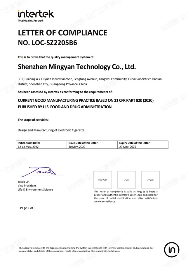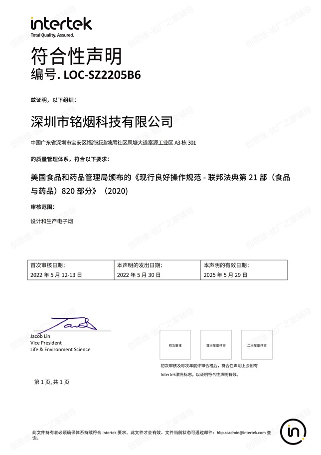 2022年5月12日-13日,國際認證機構(gòu)INTERTEK(ITS) 專家及深圳市創(chuàng)思維企業(yè)管理技術(shù)有限公司技術(shù)經(jīng)理、GMP輔導(dǎo)老師一起,對深圳銘煙電子煙、電子霧化器生產(chǎn)基地、煙油灌裝車間、包裝車間、成品倉庫、更衣室、化學品倉等進行了GMP 820認證現(xiàn)場檢查。經(jīng)過2天嚴格、細致的檢查,順利通過檢查,并取得GMP-820認證證書。