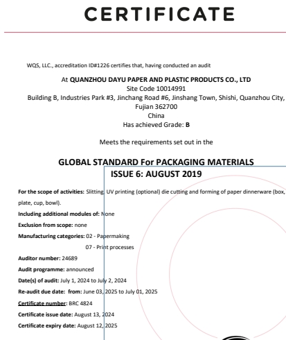 在創(chuàng)思維驗(yàn)廠網(wǎng)老師專業(yè)技術(shù)、全程跟進(jìn)耐心細(xì)致輔導(dǎo)以及公司全體員工配合下,一次性順利通過FSC認(rèn)證、BRC認(rèn)證、SEDEX-4p驗(yàn)廠審核,為將來公司發(fā)展奠定了良好的發(fā)展基礎(chǔ),既開拓了市場(chǎng)同時(shí)也增加了消費(fèi)者對(duì)公司的信賴,在這里再次祝賀泉州大宇包裝制品有限公司2024年一次性成功通過FSC認(rèn)證、BRC認(rèn)證、SEDEX-4p驗(yàn)廠審核,同時(shí)也期待未來再次與創(chuàng)思維驗(yàn)廠網(wǎng)合作!